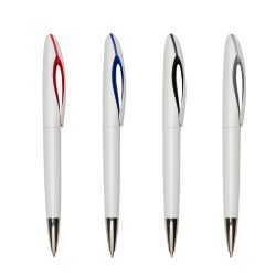 Caneta Plástica Personalizada RJ com detalhes coloridos, escrita azul. Caneta plástica corpo branco.